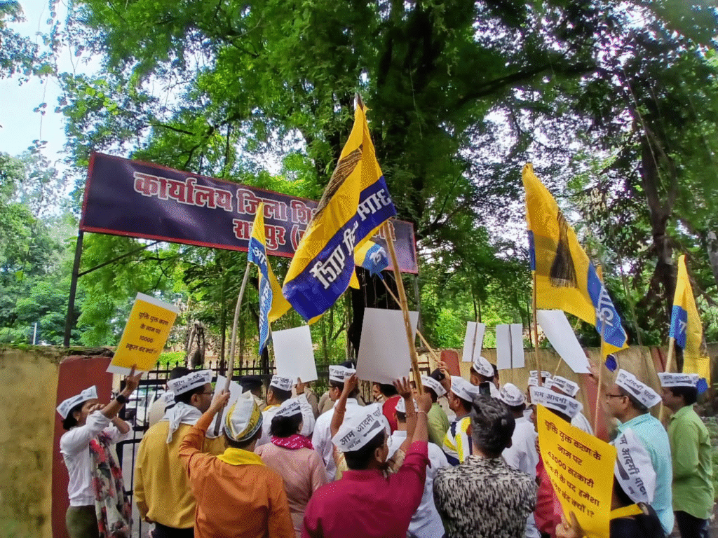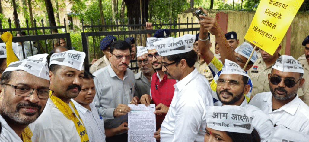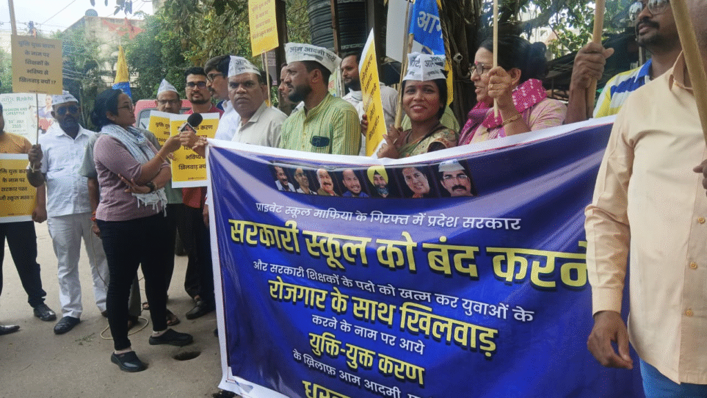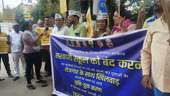 युक्तियुक्तकरण के खिलाफ आम आदमी पार्टी का प्रदेश धरना प्रदर्शन