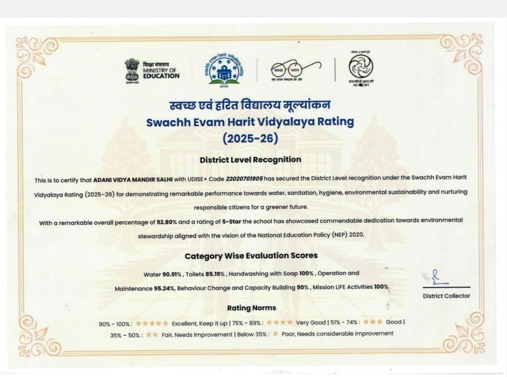 साल्ही/उदयपुर-अंबिकापुर, 18 फरवरी 2026। ग्रामीण अंचल में गुणवत्तापूर्ण शिक्षा, स्वच्छता और पर्यावरण संरक्षण की मिसाल पेश करते हुए अदाणी विद्या मंदिर सरगुजा को केंद्र सरकार की ग्रीन एंड क्लीन स्कूल पहल के तहत ‘क्लीन एंड ग्रीन स्कूल ऑफ द डिस्ट्रिक्ट’ सम्मान से नवाजा गया है। जिले के 2,365 से अधिक विद्यालयों के विस्तृत निरीक्षण के बाद स्कूल ने सभी मानकों पर उत्कृष्ट प्रदर्शन करते हुए पहला स्थान हासिल किया और पाँच-सितारा रेटिंग प्राप्त की।यह सम्मान 77वें गणतंत्र दिवस समारोह के अवसर पर छत्तीसगढ़ के उपमुख्यमंत्री विजय शर्मा द्वारा प्रदान किया गया। कार्यक्रम में जिलाधीश अजीत वसंत, राजेश अग्रवाल तथा जिला शिक्षा अधिकारी सहित अनेक गणमान्य उपस्थित रहे। विद्यालय की ओर से उप-प्रधानाचार्य डॉ. टी. एल. वर्मा ने सम्मान ग्रहण किया।निरीक्षण के दौरान विद्यालय ने हाथ धोने की सुविधा और मिशन लाइफ के प्रभावी क्रियान्वयन में 100 प्रतिशत अंक प्राप्त किए। स्कूल मेंटेनेंस में 95.24 प्रतिशत, व्यवहार परिवर्तन आधारित स्वच्छ आचरण में 90 प्रतिशत, सुरक्षित पेयजल व्यवस्था में 90.91 प्रतिशत तथा शौचालय सुविधाओं में 85.19 प्रतिशत अंक दर्ज किए गए। समग्र रूप से यह प्रदर्शन जिले में सर्वोच्च रहा।दो वर्षों में व्यापक हरित पहलपिछले दो वर्षों में विद्यालय परिसर में शुद्ध पेयजल प्रणाली, रेनवॉटर हार्वेस्टिंग, 80 केवीए क्षमता का सोलर प्लांट, किचन गार्डन तथा स्वच्छ शौचालय व्यवस्था विकसित की गई है। छात्रों के नियमित स्वास्थ्य परीक्षण, काउंसलिंग और हाथ धोने की आदत को बढ़ावा देने जैसी पहलों ने परिसर को स्वच्छ, सुरक्षित और पर्यावरण-अनुकूल बनाया है। इन गतिविधियों में विद्यार्थियों की सक्रिय भागीदारी ने अभियान को मजबूत आधार दिया है।ग्रामीण क्षेत्र का प्रमुख शैक्षणिक केंद्रग्रामीण सरगुजा क्षेत्र में स्थित यह विद्यालय वर्तमान में 1,040 विद्यार्थियों को गुणवत्तापूर्ण शिक्षा प्रदान कर रहा है। 35 किलोमीटर के दायरे में यह एकमात्र CBSE मान्यता प्राप्त विद्यालय है और छत्तीसगढ़ का इकलौता स्कूल है जिसे NABET प्रमाणन प्राप्त है। NABET, क्वालिटी काउंसिल ऑफ इंडिया के अंतर्गत शैक्षणिक संस्थानों को गुणवत्ता आधारित मान्यता प्रदान करता है। पोषण और आजीविका का समन्वयविद्यालय में नाश्ता और मध्याह्न भोजन की व्यवस्था स्थानीय महिला स्व-सहायता समूह MUBSS द्वारा संचालित की जाती है। 250 से अधिक महिलाओं से जुड़े इस समूह की 17 सदस्य प्रतिदिन लगभग 1,000 बच्चों के लिए पौष्टिक भोजन तैयार करती हैं। नाश्ते में मौसमी फल, दूध-हॉर्लिक्स तथा सप्ताहिक मेन्यू में दलिया, पोहा और उबला चना शामिल है, जबकि दोपहर के भोजन में दाल, चावल, रोटी, सब्जी के साथ सप्ताह में काबुली चना और 