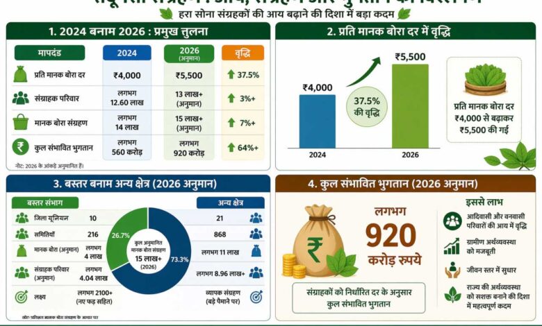 वन मंत्री श्री केदार कश्यप के निर्देशानुसार राज्य शासन द्वारा लघु वनोपज संग्राहकों, विशेषकर आदिवासी समुदाय की आय बढ़ाने के उद्देश्य से तेन्दूपत्ता संग्रहण दर में महत्वपूर्ण वृद्धि की गई है। वर्ष 2024 से प्रति मानक बोरा की दर 4 हजार रुपए से बढ़ाकर 5 हजार 500 रुपए कर दी गई है, जिसका सीधा लाभ लाखों ग्रामीण परिवारों को मिलेगा। वर्ष 2026 में राज्य के 31 जिला वनोपज सहकारी यूनियनों के अंतर्गत 902 प्राथमिक समितियों में तेन्दूपत्ता संग्रहण कार्य प्रस्तावित है। इस वर्ष लगभग 15 लाख से अधिक मानक बोरा तेन्दूपत्ता संग्रहण का अनुमान है। एक मानक बोरे में 1000 गड्डियां होती हैं और प्रत्येक गड्डी में 50 पत्ते शामिल रहते हैं।