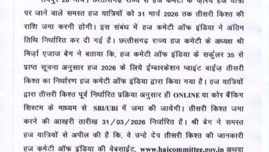 रायपुर 26 मार्च। छत्तीसगढ़ राज्य से हज कमेटी के ज़रिये हज यात्रा पर जाने वाले समस्त हज यात्रियों को 31…