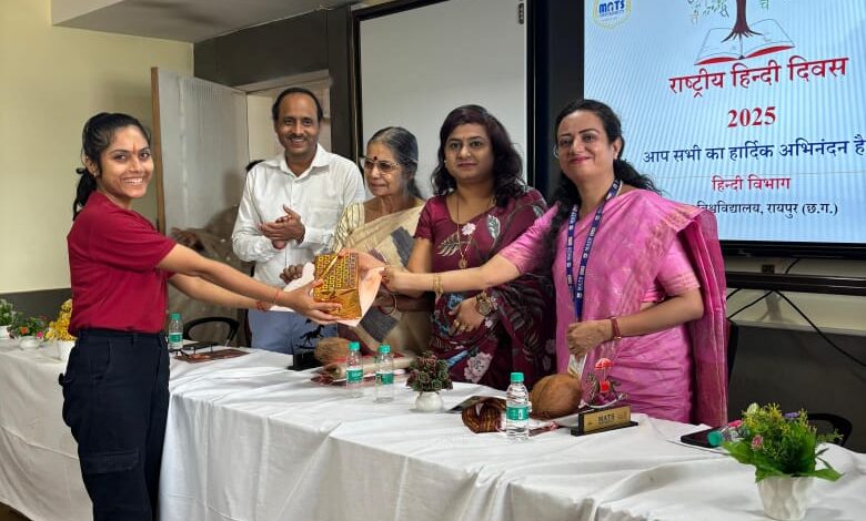 रायपुर। मैट्स विश्वविद्यालय के हिंदी विभाग द्वारा राष्ट्रीय हिंदी दिवस के अवसर पर हिंदी सप्ताह का आयोजन 8 सितंबर से 14 सितंबर तक कार्यशाला के रूप में किया गया। 14 सितंबर को हिन्दी दिवस के अवसर पर आयोजित समापन समारोह में मुख्य अतिथि के रूप में छत्तीसगढ़ की वरिष्ठ महिला साहित्यकार एवं सेवानिवृत्त प्राध्यापक डॉ सत्यभामा आड़िल एवं कार्यक्रम के अध्यक्ष के रूप में छत्तीसगढ़ राज्य भाषा आयोग की सचिव डॉ अभिलाषा बेहार सहित उपकुलपति डॉ. दीपिका ढांढ, कुलसचिव श्री गोकुलानंदा पंडा प्रमुख रूप से उपस्थित रहे। कार्यक्रम का प्रारंभ सरस्वती वंदना एवं दीप प्रज्वलन से हुआ । कार्यक्रम के शुभारंभ में हिंदी विभाग की विभागाध्यक्ष डॉ. रेशमा अंसारी ने स्वागत भाषण प्रस्तुत करते हुए कहा कि हिंदी केवल एक भाषा नहीं, बल्कि भारतीय संस्कृति की आत्मा है। यह हमें एक-दूसरे से जोड़ती है और अपनी जड़ों से जुड़े रहने का कार्य करती है। इस अवसर पर मुख्य अतिथि के रूप में डॉ. सत्यभामा आड़िल ने अपने संबोधन में कहा कि वैश्विक प्रतिस्पर्धा के इस युग में हिंदी को आधुनिक तकनीक और संचार माध्यमों से जोड़ना समय की आवश्यकता है। साथ ही, उन्होंने क्षेत्रीय भाषाओं के महत्व पर भी प्रकाश डालते हुए कहा कि ये भाषाएँ हमारी सांस्कृतिक विविधता और भाषाई धरोहर को जीवित रखती हैं। कार्यक्रम की अध्यक्षता कर रही छत्तीसगढ़ राज्य भाषा आयोग की सचिव डॉ अभिलाषा बेहार ने भाषा को संस्कृति और सभ्यता की धूरी बताया और कहा कि भाषा हमारे विकास की प्रतीक होती है इसका विकास और संवर्धन हमारी नैतिक जिम्मेदारी है। संपर्क भाषा के रूप में हिंदी के महत्व को नकारा नहीं जा सकता इसलिए इसका संवर्धन आवश्यक है।हिंदी सप्ताह के अंतर्गत संचालित सात दिवसीय कार्यशाला में छात्रों ने भाषा के विभिन्न कौशलों के विकास में अपना योगदान दिया । इनमें काव्य वचन ,तात्कालिक भाषण ,गीत गायन , प्रश्न मंजूषा,फोटोग्राफी , पत्रलेखन एंकरिंग, वाद-विवाद आदि प्रतियोगिताएं प्रमुख रूप से शामिल थीं।विजेताओं के नाम इस प्रकार है , इनमें मंच संचालन प्रतियोगिता में आद्या शुक्ला ने प्रथम, पायल जायसवाल ने द्वितीय और अंजुम परवीन ने तृतीय स्थान प्राप्त किया। पत्र-लेखन प्रतियोगिता में अर्चना वर्मा प्रथम, आद्या शुक्ला द्वितीय तथा आदित्य शुक्ला और रुक्मणी पटेल ने संयुक्त रूप से तृतीय स्थान प्राप्त किया। ततपश्चात भाषण प्रतियोगिता में आद्या शुक्ला ने प्रथम, खुशी विभार ने द्वितीय और इशान शर्मा ने तृतीय स्थान प्राप्त किया। कविता वाचन प्रतियोगिता में उमा शर्मा प्रथम, गौरव महेश्वरी द्वितीय और खुशी विभार तृतीय रहीं। गीत-गायन प्रतियोगिता में अमृतांश श्रीवास्तव ने प्रथम, शिवम सोनी ने द्वित