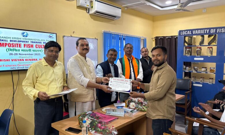 रायपुर। इंदिरा गांधी कृषि विश्वविद्यालय, कृषि विज्ञान केन्द्र, रायपुर के द्वारा तीन दिवसीय मिश्रित मत्स्य पालन विषय पर प्रशिक्षण आज दिनांक 29 नवम्बर 2025 को समापन हुआ। यह प्रशिक्षण राष्ट्रीय मात्स्यिकी विकास बोर्ड, हैदराबाद द्वारा प्रायोजित था, इस प्रशिक्षण में छत्तीसगढ़ राज्य के अलग- अलग जिलों से कुल 25 प्रशिक्षणार्थियों ने सक्रिय रूप से भाग लिया ।इस प्रशिक्षण के उद्घाटन समारोह में मुख्य अतिथि के रूप में डॉ. अजय कुमार वर्मा, अधिष्ठाता, स्वामी विवेकानंद कॉलेज ऑफ एग्रीकल्चरल इंजीनियरिंग एवं टेक्नोलॉजी. इं.गां.कृ.वि. उपस्थित रहे. साथ ही साथ विशिष्ठ अतिथि के रूप में डॉ. एस. आर गौर, प्राध्यापक (मात्स्यिकी) उपस्थित थी। इस कार्यक्रम के उदबोधन में कृषि विज्ञान केन्द्र, रायपुर के वरिष्ठ वैज्ञानिक एवं प्रमुख डॉ. गौतम रॉय ने अपने उदबोधन में कृषि विज्ञान केन्द्र, रायपुर में चल रहे मछली पालन की विभिन्न गतिविधियों के बारे में विस्तार से सभी को अवगत कराया। प्रशिक्षण प्रभारी डॉ. एस. सासमल ने अपने उद्बोधन में तीन दिवसीय प्रशिक्षण के रूपरेखा को विस्तृत जानकारी दिए। प्रशिक्षण के विशिष्ठ अतिथि डॉ. एस. आर गौर, प्राध्यापक ने आज के समय में मिश्रित मछली पालन क्यों जरूरी है उसके बारे में बतायें। इस दौरान सारे अतिथि द्वारा मिश्रित मत्स्य पालन पद्धति विषय पर तैयार तकनीकी बुलेटिन का विमोचन किया गया। इस कार्यक्रम के मुख्य अतिथि डॉ. अजय कुमार वर्मा, अधिष्ठाता ने बताया कि छत्तीसगढ़ के साथ साथ पूरे देश में मछली पालन के क्षेत्र में डॉ. एस. सासमल एक जाना पहचाना नाम है यह विश्वविद्यालय के लिए बहुत ही गर्व की बात है। उन्होने यह भी बताया कि सिर्फ भारत से ही नही बल्कि विदेशों से भी प्रशिक्षण लेने के लिए प्रशिक्षनार्थी इंदिरा गांधी कृषि विश्वविद्यालय, कृषि विज्ञान केन्द्र, रायपुर में प्रशिक्षण लेने आए अन्त में श्री तोषण कुमार ठाकुर, वरिष्ठ वैज्ञानिक एवं प्रमुख केविके बेमेतरा ने इस प्रशिक्षण में सम्मिलित हुए मुख्य अतिथि, विशिष्ठ अतिथि एवं प्रशिक्षनार्थियों का आभार प्रकट किए। इस प्रशिक्षण के उद्घाटन सत्र के बाद दो सत्रों में मिश्रित मत्स्य पालन पद्धति के विषय पर डॉ. एस. आर गौर, प्राध्यापक एवं श्री तोषण कुमार ठाकुर ने विस्तृत रूप से जानकारी दिए ।-प्रशिक्षण के दुसरे दिन डॉ. एस. सासमल एवं डॉ. अंकित ठाकुर ने मिश्रित मछली पालन को प्रायोगिक रूप से कैसे करते है उसके बारे में प्रक्षेत्र में प्रशिक्षण दिये इस कड़ी में तालाबों का चयन, मछली बीज संचयन, खाद प्रबंधन, प्राकृतिक भोजन उत्पादन आदि को प्रायोगिक रूप से दिखायें प्रशिक्षण के अंतिम दिवस में श्री अमित वर्मा, मत्स्य निरीक्षक, मछली पालन विभाग, रायपुर ने मछली पाल