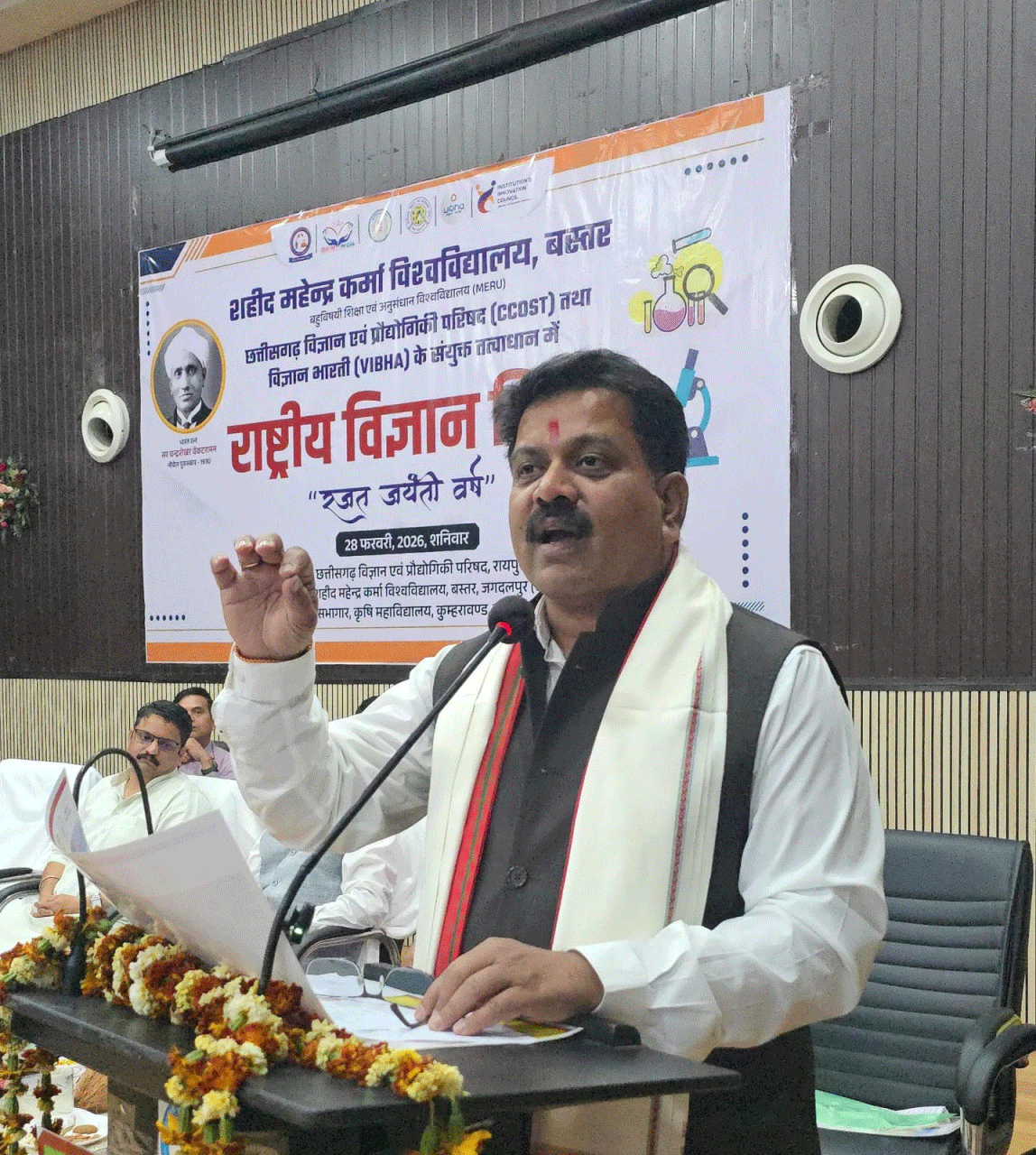 रायपुर, राष्ट्रीय विज्ञान दिवस के अवसर पर जगदलपुर में आयोजित कार्यक्रम में उप मुख्यमंत्री श्री विजय शर्मा मुख्य अतिथि के रूप में शामिल हुए। यह समारोह शहीद महेंद्र कर्मा विश्वविद्यालय, छत्तीसगढ़ विज्ञान एवं प्रौद्योगिकी परिषद तथा विज्ञान भारती के संयुक्त तत्वाधान में कृषि महाविद्यालय के सभागार में आयोजित किया गया। कार्यक्रम में विज्ञान के क्षेत्र में नवाचार, शोध एवं वैज्ञानिक सोच को बढ़ावा देने पर विशेष जोर दिया गया।
