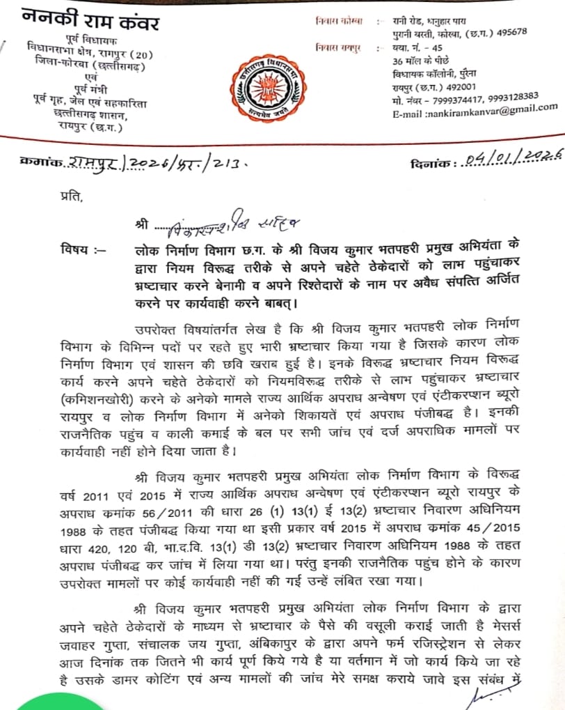 रायपुर। छत्तीसगढ़ के पूर्व गृह मंत्री और वरिष्ठ भाजपा नेता ननकी राम कंवर की एक चिट्ठी ने एक बार फिर सत्ता और संगठन के गलियारों में हलचल मचा दी है। इस बार ननकी राम कंवर ने राज्य के मुख्य सचिव विकासशील को पत्र लिखकर लोक निर्माण विभाग (PWD) के मुख्य अभियंता विजय कुमार भतपहरी पर गंभीर भ्रष्टाचार के आरोप लगाए हैं और पूरे मामले की सीबीआई जांच कराने की मांग की है। पत्र सामने आने के बाद प्रशासनिक और राजनीतिक हलकों में चर्चा तेज हो गई है। पूर्व गृह मंत्री ननकी राम कंवर ने अपने पत्र में आरोप लगाया है कि विजय कुमार भतपहरी ने लोक निर्माण विभाग में विभिन्न पदों पर रहते हुए बड़े पैमाने पर भ्रष्टाचार किया है, जिससे न केवल विभाग को आर्थिक नुकसान हुआ, बल्कि शासन की छवि भी प्रभावित हुई है। उन्होंने लिखा है कि भतपहरी ने अपने चहेते ठेकेदारों को नियमों को दरकिनार कर अनुचित लाभ पहुंचाया और कमीशनखोरी के जरिए अवैध कमाई की।