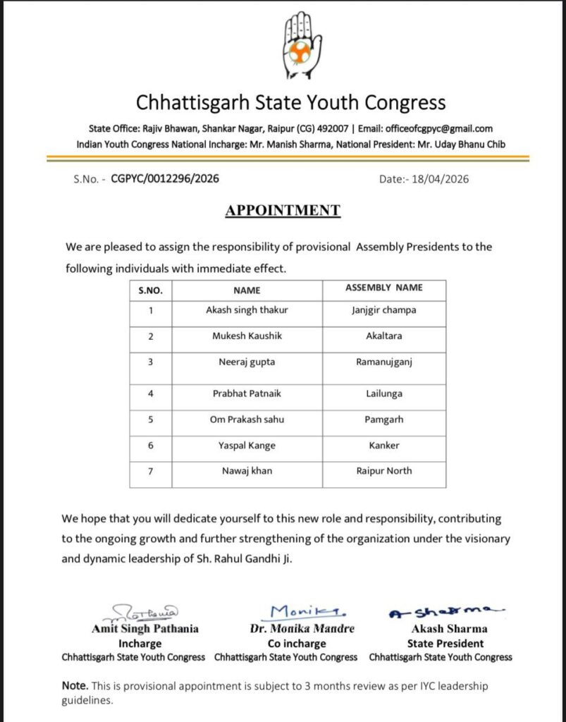 उनके कार्यों और संगठन के प्रति निष्ठा को देखते हुए छत्तीसगढ़ प्रदेश युवा कांग्रेस के प्रदेश अध्यक्ष श्री आकाश शर्मा, प्रभारी श्री अमित सिंह पठानिया एवं सह-प्रभारी डॉ. मोनिका मंदरे ने आज दिनांक 18/04/2026 को पत्र क्रमांक CGPYC/0012296/2026 के माध्यम से उन्हें *पूर्ण रूप से रायपुर उत्तर विधानसभा युवा कांग्रेस का अध्यक्ष* नियुक्त किया है।