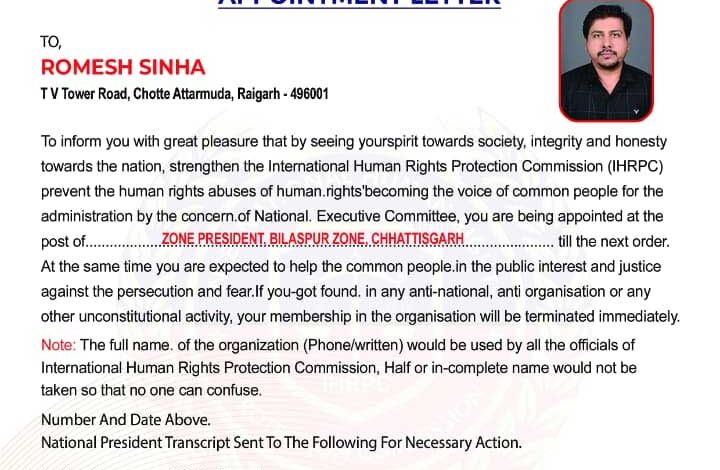 रायगढ़/बिलासपुर — अंतर्राष्ट्रीय मानव अधिकार संरक्षण आयोग के छत्तीसगढ़ प्रदेश अंतर्गत जिला रायगढ़ के जिला अध्यक्ष रोमेश सिन्हा को उनके उत्कृष्ट कार्य, संगठन के प्रति निष्ठा एवं मानव अधिकार संरक्षण के क्षेत्र में किए गए उल्लेखनीय योगदान को देखते हुए पदोन्नत किया गया है।