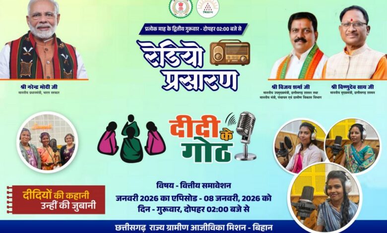 पंचायत एवं ग्रामीण विकास विभाग के तत्वावधान में छत्तीसगढ़ राज्य ग्रामीण आजीविका मिशन बिहान द्वारा संचालित लोकप्रिय रेडियो कार्यक्रम ‘दीदी के गोठ’ का छठवां एपिसोड आगामी 08 जनवरी 2026 को प्रसारित किया जाएगा। यह एपिसोड वित्तीय समावेशन की थीम पर आधारित होगा, जिसमें स्व-सहायता समूहों से जुड़ी ग्रामीण महिलाओं की आर्थिक सशक्तिकरण से जुड़ी प्रेरक कहानियों को प्रमुखता से प्रस्तुत किया जाएगा।